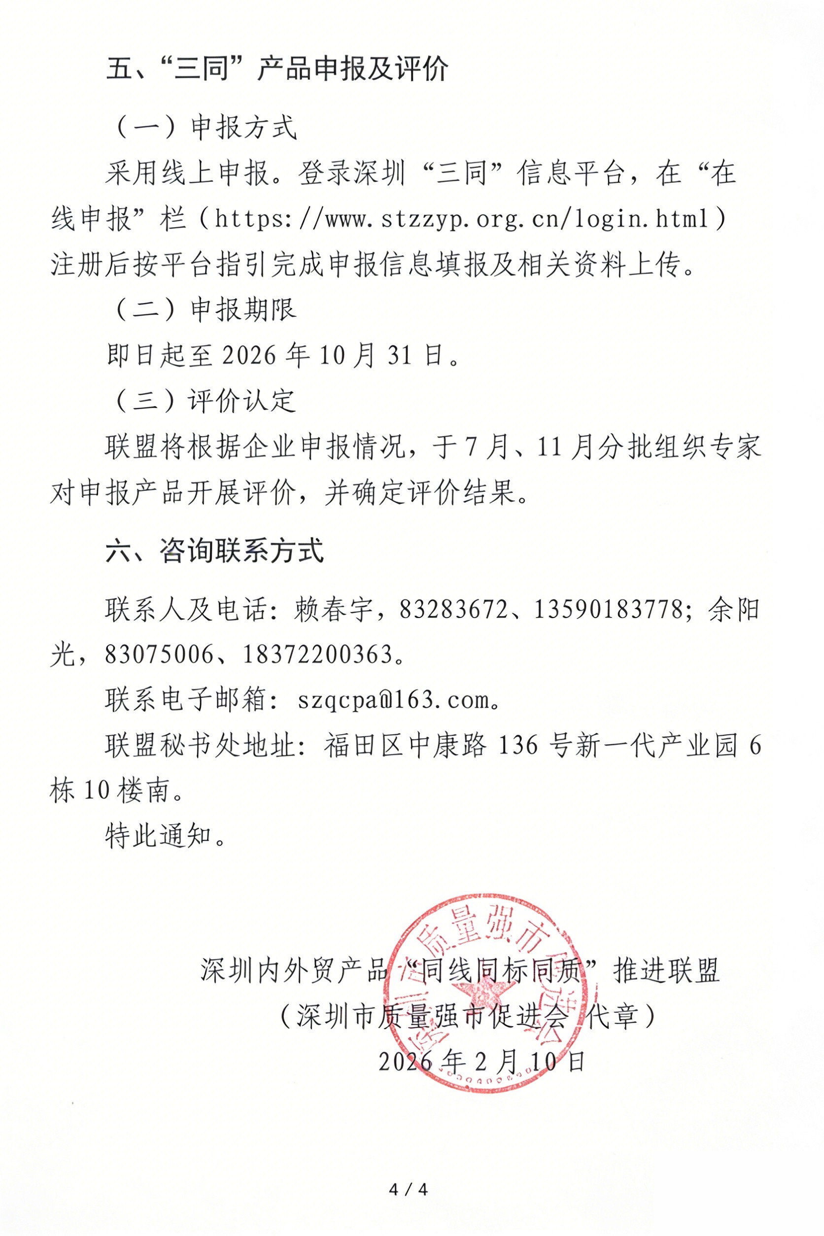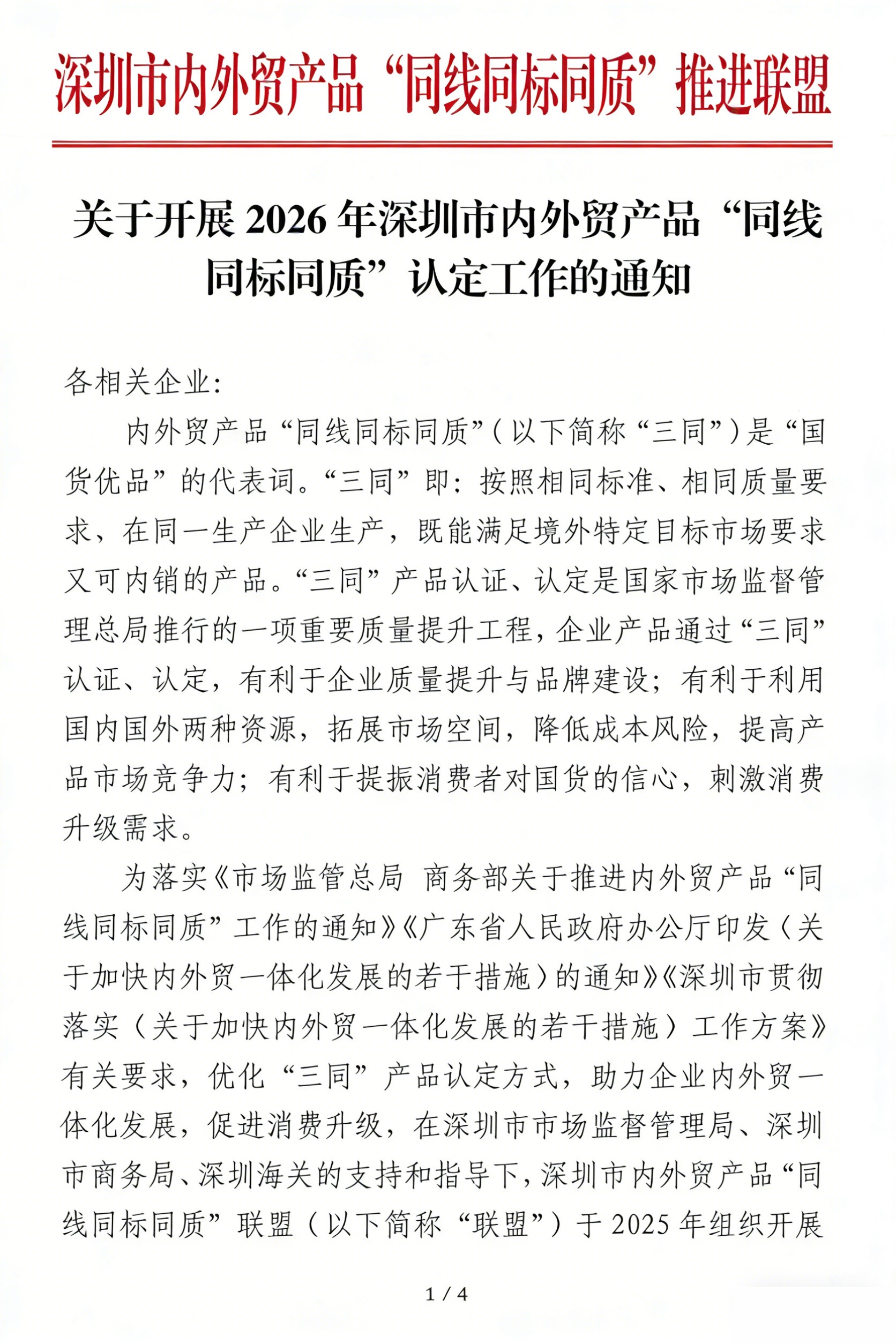 关于开展2026年深圳市内外贸产品“同线同标同质”认定工作的通知